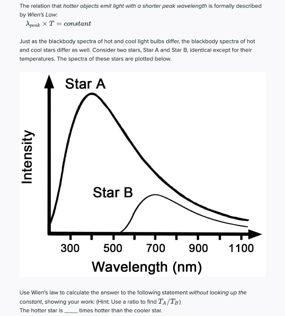 The peak of the wavelength. Wien wavelength displacement law constant†. The equation does accurately describe the short wavelength (high frequency) spectrum of thermal emission from objects, but it fails to. Wien's law, λ max t = constant, can be used to estimate the surface temperature of any stellar body by assuming it to behave like a blackbody. Solving for peak emission wavelength. Wien's law, also called wien's displacement law, relationship between the temperature of a blackbody (an ideal substance that emits and absorbs all frequencies of light) and the wavelength at which it emits the most light. According to wien's law the product of wavelength corresponding to maximum intensity of radiation and temperature of body (in kelvin) is constant i.e, λm t = b = constant where b is wien's constant and has value 2.89×10−3m−k. Experimentally the constant is found to be 2.898 × 10−3 m. Planck's equation for the exitance per unit wavelength interval (equation 2.6.1) is. Wien's displacement law when the temperature of a blackbody radiator increases, the overall radiated energy increases and the peak of the radiation curve moves to shorter wavelengths. When the temperature of a blackbody radiator increases, the overall radiated energy increases and the peak of the radiation curve moves to shorter wavelengths. This is an inverse relationship between wavelength and temperature. However, for the course of the demo, it is treated as such.